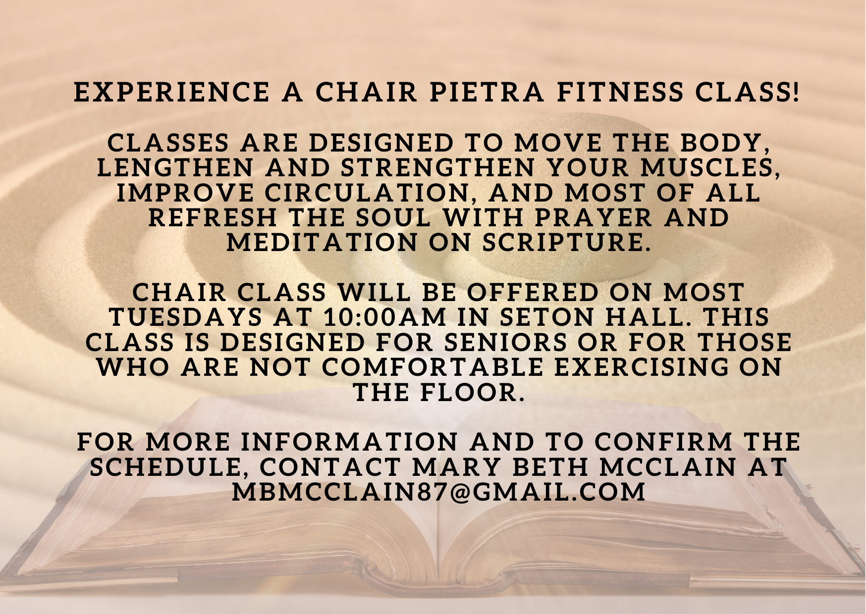 Pietra Fitness for Women classes are designed to move the body, lengthen and strengthen your muscles, improve circulation, and most of all refresh the soul with prayer. In only one hour you will feel calmer, stronger, refreshed and renewed. Meditation themes will center on Renewal of Body and Soul!